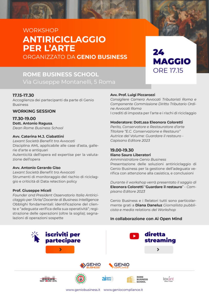 Questo imprescindibile aspetto per il mercato dell’Arte, alla luce delle trasformazioni e delle possibilità tecnologiche e di Intelligenza Artificiale dell’attuale momento storico, è l’oggetto del Workshop “Antiriciclaggio per l’arte” organizzato da Genio Business, in collaborazione con Ai Open Mind, che si terrà oggi a Roma presso la Rome Business School.