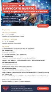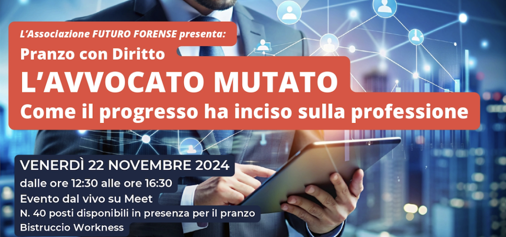 Questi argomenti saranno affrontati durante l’evento “L’AVVOCATO MUTATO – Come il progresso ha inciso sulla professione”, venerdì 22 novembre 2024 presso Bistruccio Workness. Sarà un evento dal vivo e su Meet e ci saranno 40 posti disponibili in presenza per il pranzo.